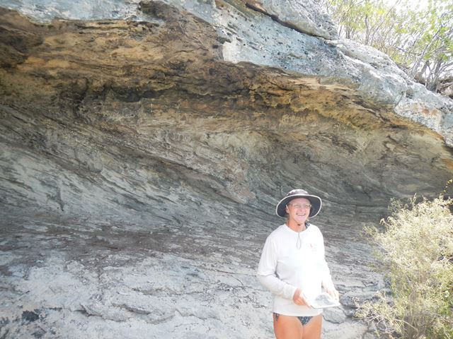 The sun is out. Explore the Exuma Sound side of Stocking Island. Found lots of pools and cascades among the rocks along the beach. In the evening there was a birthday party for Ted WIlliams at flip-flop beach. This is now quiite an affair with tables, a firepit, benches and an elaborate gazebo; all constructed by cruisers over the years. The party was supposed to have been at Salt Pond several days ago, but the morning of departure he ran aground and couldn't get out in time to make the sail to LI to attend his party. Those who did get there had a party on his behalf and constructed a cardboard effigy so that he could be there in spirit. |