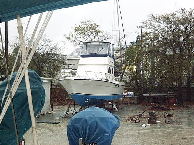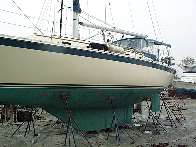 Andante was taken to Progressive to have her bottom done: Ground down, new barrier coat, new primer and new paint. They also put in a new cutless bearing and put on a new prop. In the photos above you can see a few of her neighbors. |