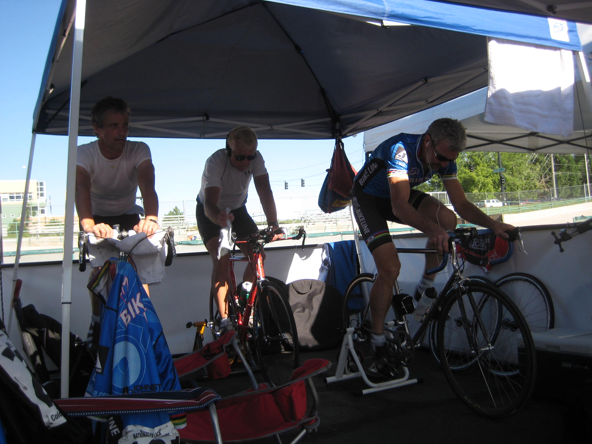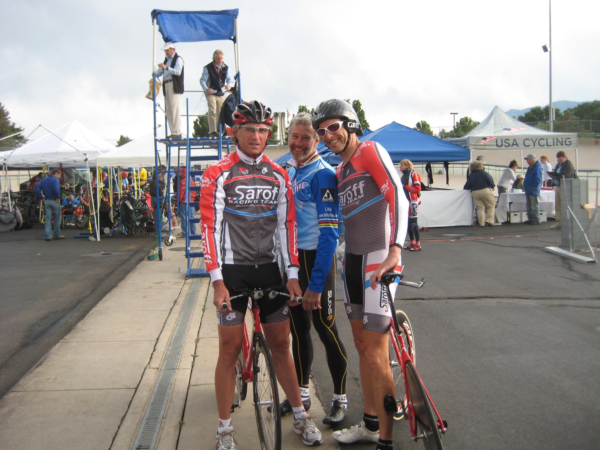 | At the left Chip is making sure Chris and Don are ready to ride their 2 km events. Don and Michelle at the right. She was the official photographer for our crowd. | |