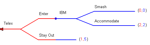 A. This is a game depicting the market for mainframe computers in the late 1960’s. IBM is the incumbent and Telex is thinking of entering the market with its own plug-and-play components. If Telex stays out then it is profitable in another market niche. If Telex enters then IBM can either smash Telex by cutting prices to the bone or accommodate. The payoffs of either action are shown.