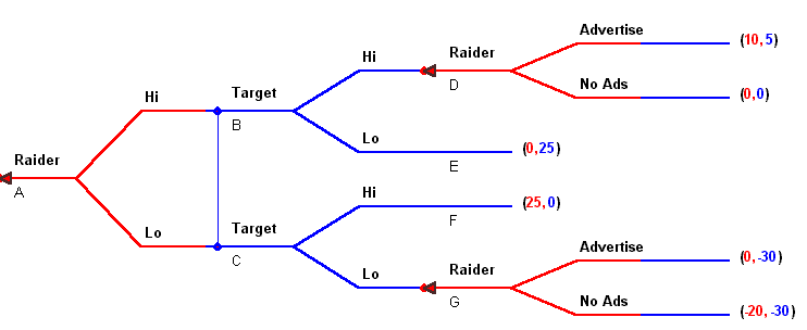 In this game the firm Raider has entered the market for computer chip sets. Target has had the market to itself. Simultaneously Raider and Target must choose a price strategy: Hi or Lo. Subsequently Raider then chooses an advertising plan. If Raider observes that both firms have chosen the same price strategy then she chooses between running advertisements or running no ads. If the firms have chosen different price plans then there is no advertising. The payoffs are shown at the terminal ends of the game tree.