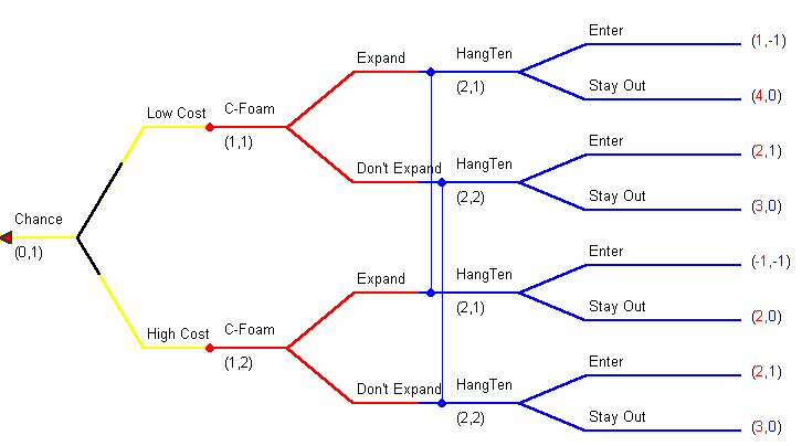 The new wave in the game is that HangTen chooses to enter after C-Foam has decided to expand. But upon seeing C-Foam's new large plant, HangTen still doesn't know whether or not C-Foam is high or low cost. The game tree is pictured below and you can click here to get the Gambit *.efg game file.