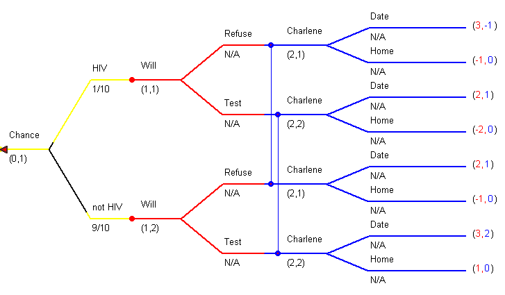 If Will has HIV, agrees to the test, and Charlene agrees to the date then their payoffs are (2, 1); Will gets the date and presumably Charlene is well enough informed to avoid risky behavior. If Will does not have HIV, declines the test, and Charlene stays home then their payoffs are (-1, 0); Charlene's payoff is obvious. Will's payoff is -1 since he lost out on the date due to his own pigheadedness. The rest of the payoffs are reasoned in a similar manner. Before going further we put the payoffs in tabular form. This is NOT the strategic form of the game since it does not make use of the strategy profiles for Will and Charlene.