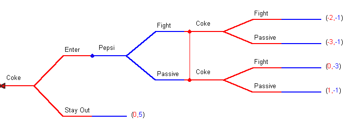 Pepsi already sells its product line in Erehwon and Coke is contemplating entry into the market; they can either enter or stay out. If Coke enters then Pepsi can either fight an aggressive marketing war or remain passive and share the market. After entry, once Coke sees Pepsi's marketing response they too can either fight or be passive and share the market peacefully.