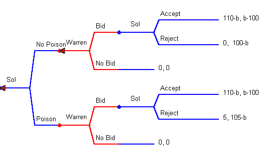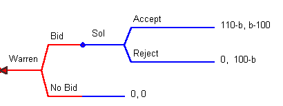 Warren's payoff is the first entry and Sol's is the second entry. Suppose that Warren bids $105, then Sol will accept the offer; he prefers to make $5 rather than lose $5. Working backwards, Warren will then see that he does better by making the bid. What happens if the bid is exactly $100? What happens if the bid is $110?