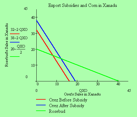 The government of Erehwon has decided that it will subsidize Orez's exports to Xanadu by paying them $.75 for each bushel sent overseas. This has the effect of lowering Orez's shipping costs by $.75/bushel. Their best response function in the Xanadu market changes accordingly from the red line to the blue line in the graph. Orez's exports to Xanadu increase from 8 bushels to 12 bushels, and Rosebud's domestic sales decline from 16 to 14 bushels. Overall, the residents of Xanadu now consume a total of 26 bushels at a price of $2.75 per bushel. Consumer surplus in Xanadu rises to $42.25, an increase of $6.25. At the same time Orez's profits in the Xanadu market have increased from $8 (=$3x8-$2x8) to $18 (=$2.75x12-$1.25x12), a gain of $10. But the subsidy costs the residents of Erehwon $9 in a lump sum tax, so the country's net gain is $1. |