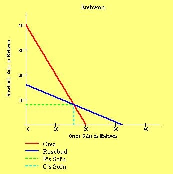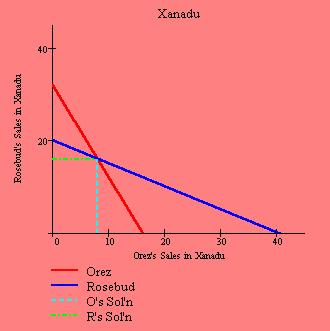 Doing the derivatives yields the best response functions for Orez and Rosebud in the Xanadu market, respectively:
