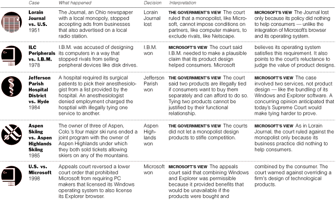 As the Justice Department and Microsoft prepare to go to trial Monday, each side is looking to previous Federal antitrust cases to buttress its arguments. But considered together, antitrust precedents can be so contradictory that both sides are sometimes finding support in the same cases.